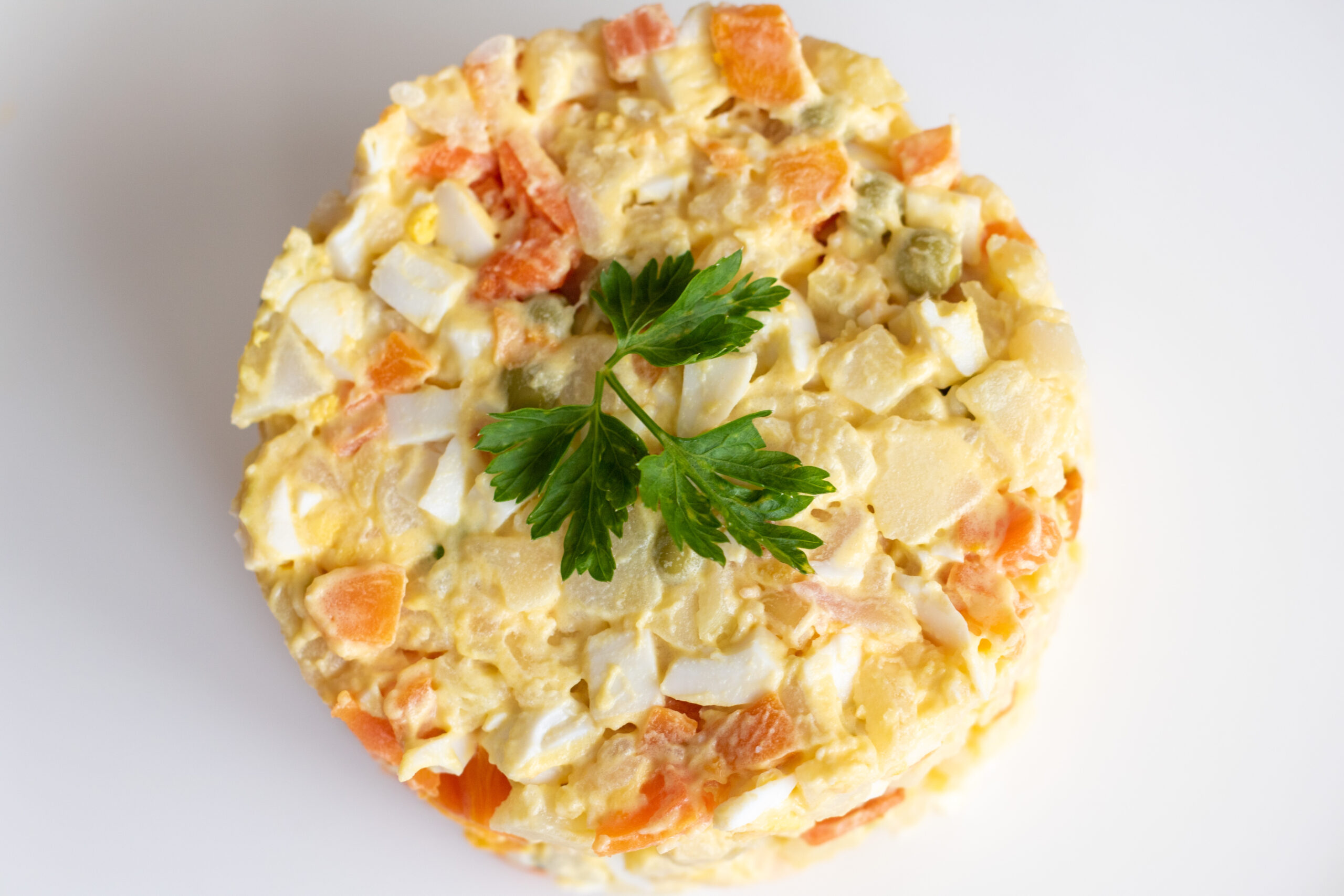 Картопля, морква, філе куряче охолоджене варене, яйця курячі фермерські, огірки солоні, горошок зелений, майонез, цибуля ріпчаста, сіль морська, перець чорний свіжозмелений, перепелині яйця.